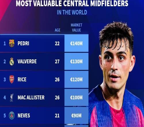 德转列中前卫身价榜:佩德里1.4亿欧居首,巴尔韦德第二