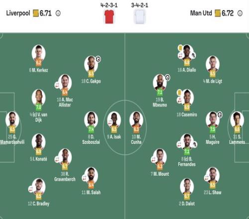 曼联(3421):31-拉门斯;4-德里赫特,5-马奎尔,23-卢克肖(85’15-约罗);16-迪亚洛(58’13-多古),18-卡塞米罗(58’25-乌加特),8-B费(85’37-梅努0,2-达洛特;19-姆伯莫,10-库尼亚;7-芒特(61’30-谢什科)