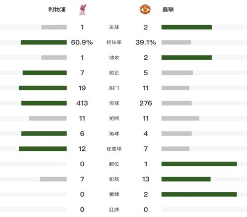 2.曼联终结做客安菲尔德英超9场不胜,上一次在这里赢球还是2016年1月。