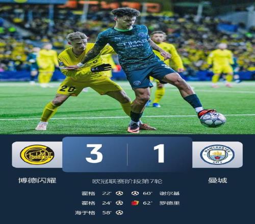 北京时间1月21日1:45,欧冠联赛小组阶段第7轮开打,英超豪门曼城客场对阵博德闪耀。此役哈兰德延续低迷表现,罗德里吃到红牌,博德闪耀球员卡斯帕-霍两分钟两球,海于格打进世界波,曼城1-3客场爆冷,遭遇各项赛事两连败。
