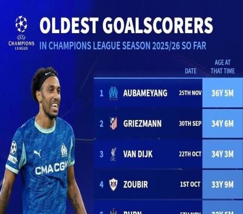 本赛季欧冠最年长进球榜:奥巴梅扬、格列兹曼、范戴克前三